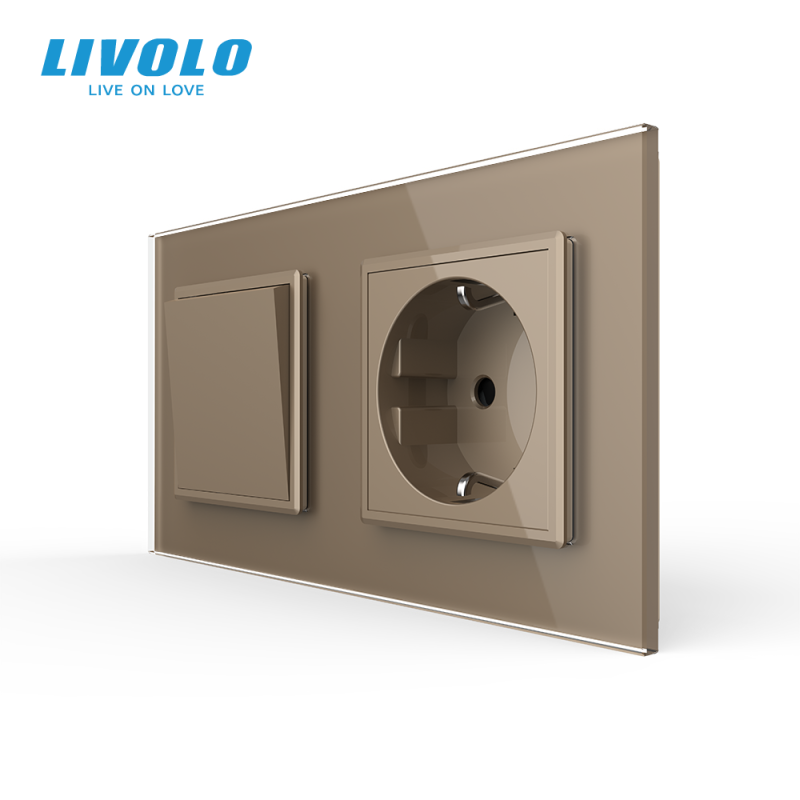 Intrerupator mecanic dublu + priza Schuko, cap / scara, cu rama sticla